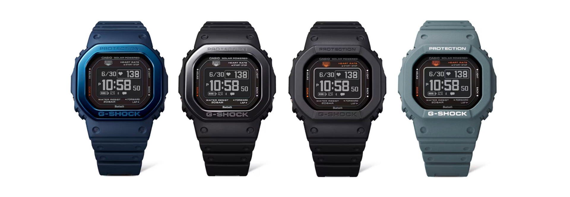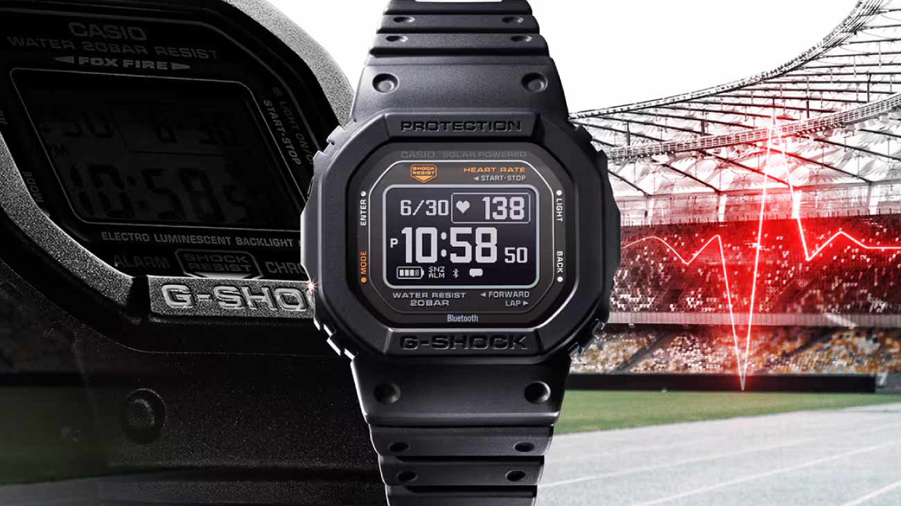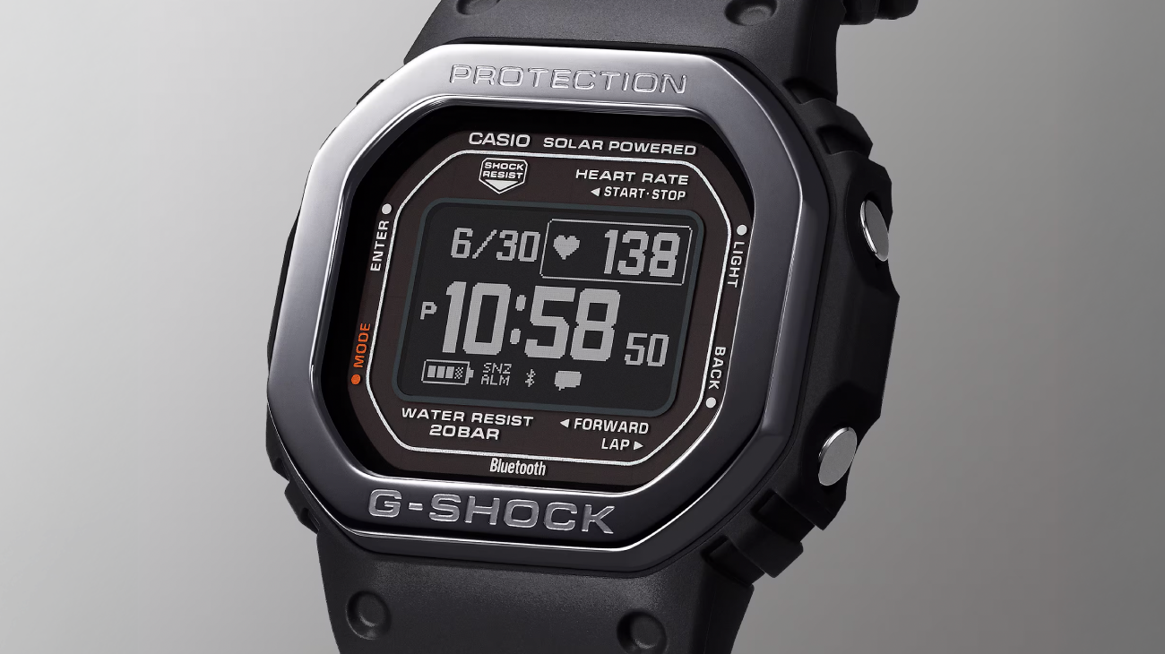 “G-SHOCK”初号機のフォルムを受け継ぎながら、スポーツシーンで便利な心拍計測機能を搭載した耐衝撃ウオッチです。心拍計測が可能な光学式センサーに加え、加速度センサーを備えることで心拍数や距離、消費カロリーなどを計測できるほか、視認性の高い高精細MIP液晶を採用しています。