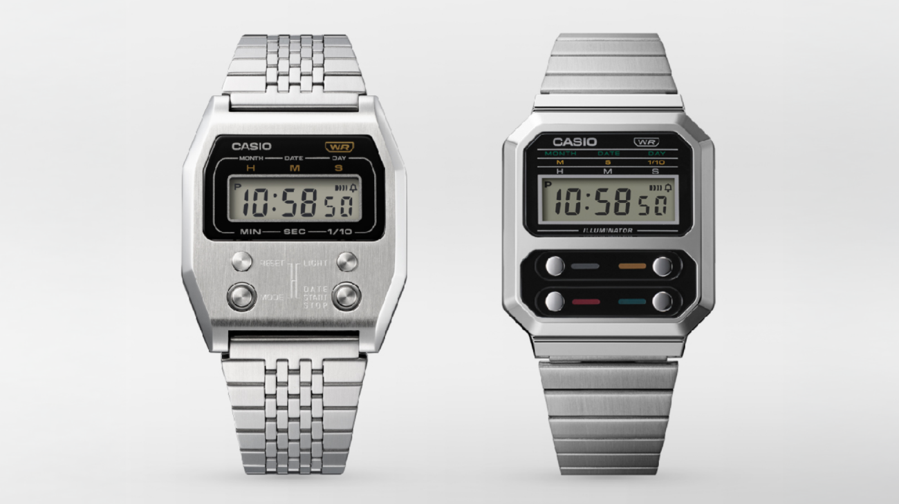 1978年に発売された当社で初めて樹脂ケースを採用したデジタルウオッチ「F-100」をベースに、バンドをメタル化し、ケースにメッキ加工を施したモデルです。フェイスのロゴや機能表記、ボタンのサイドカラーには「F-100」発売当初のオリジナルカラーを再現したほか、フロントボタンが特徴的なデザインです。