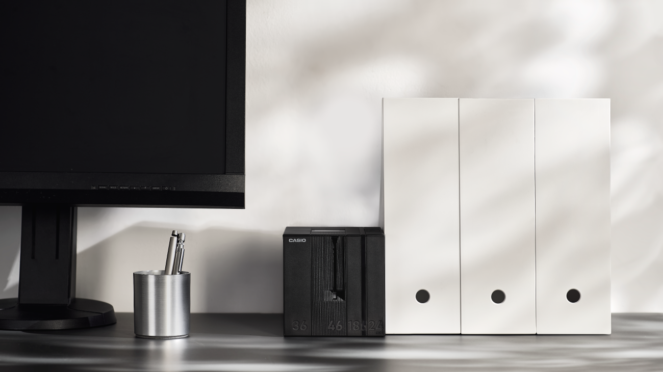 オフィスなどの使用環境にも自然と溶け込むファイルのような佇まいの造形で、筐体の分割ラインも各サイズのテープの幅を直感的に認識できる工夫がされている。実際の使用現場での課題に真摯に向き合いながら、ユーザー視点に立って細かな配慮がなされたデザインの集積が感じられる。新旧のカートリッジが使用できる構造として、環境に配慮した新規格テープへの移行を緩やかに促す試みも評価された。