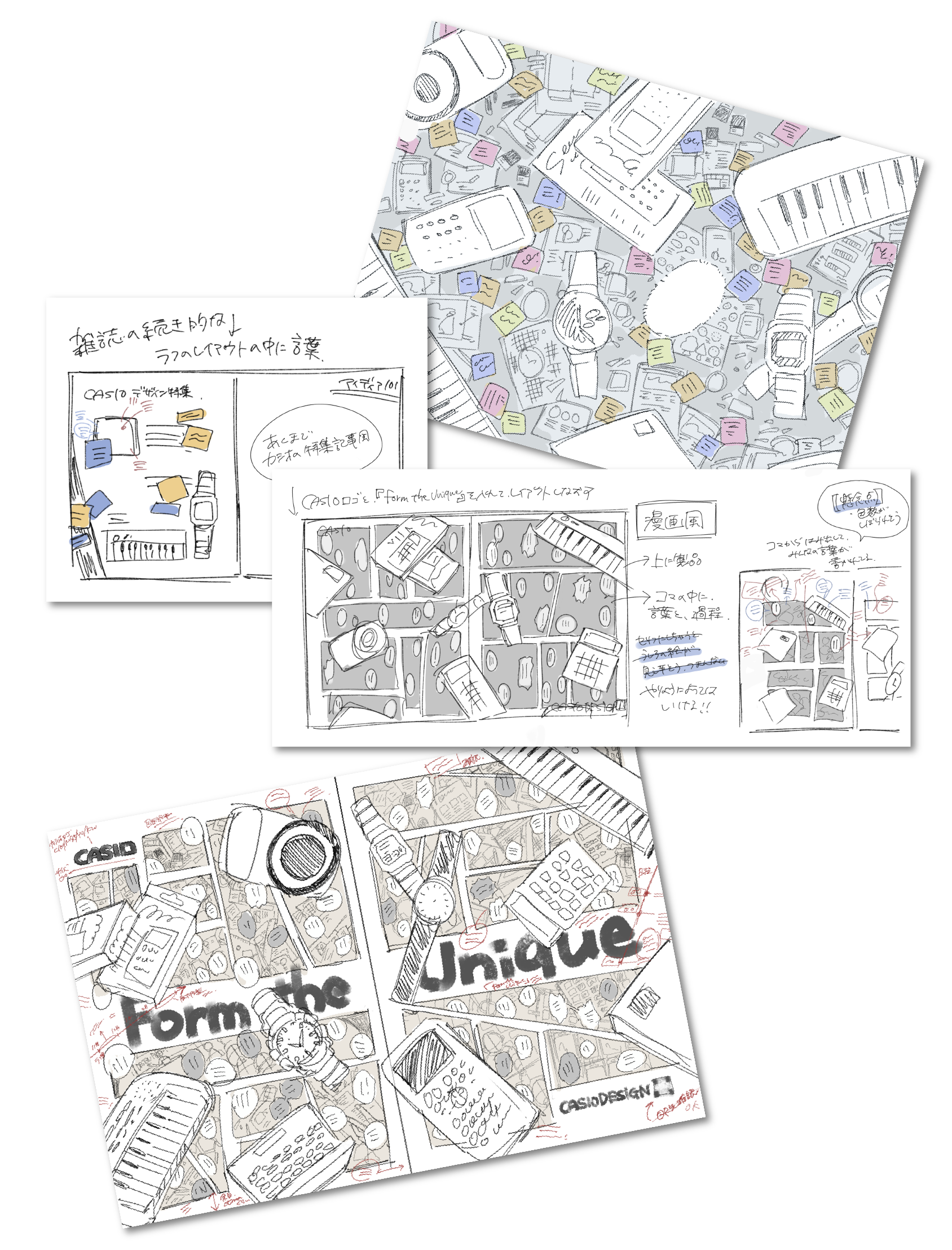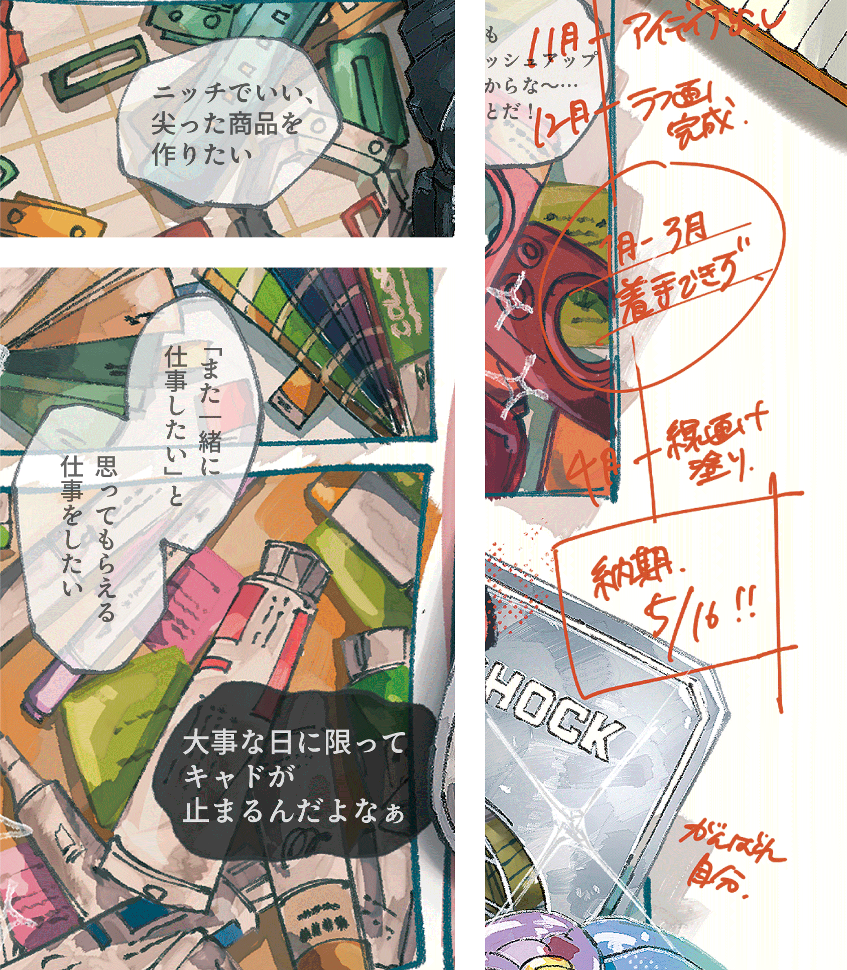 アイデアを色々描きながら考えていたのですが、デザイナーが話しているように想いを吹き出しで入れて、製品が出来るまでの過程のいくつかをコマの中で表現したら、ストーリー性も感じられて面白いかな、と思ったんです。