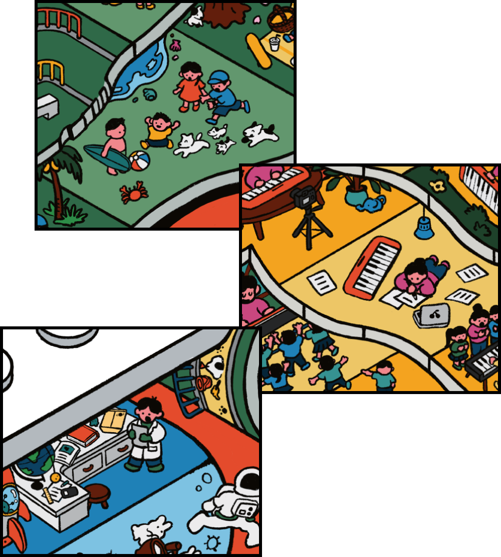 CASIOで生み出された時計、楽器、関数電卓を3人の主人公と共に、製品との出会いから、年月と共に深まっていく愛着を、スゴロクのように表現しました。